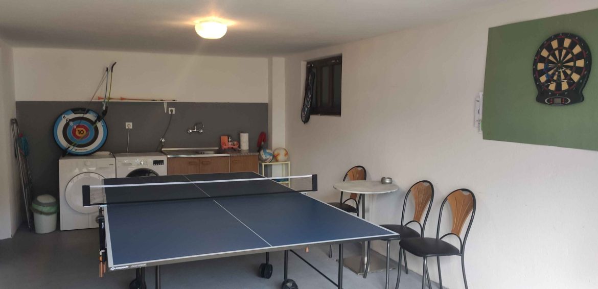 Garage area is designed for recreation and relaxation, featuring game room with table tennis, darts, balls for various sports, archery and badminton equipment, and other board and sports games. At far end of garage there is wine cellar with bar, bar stools and additional refrigerator.